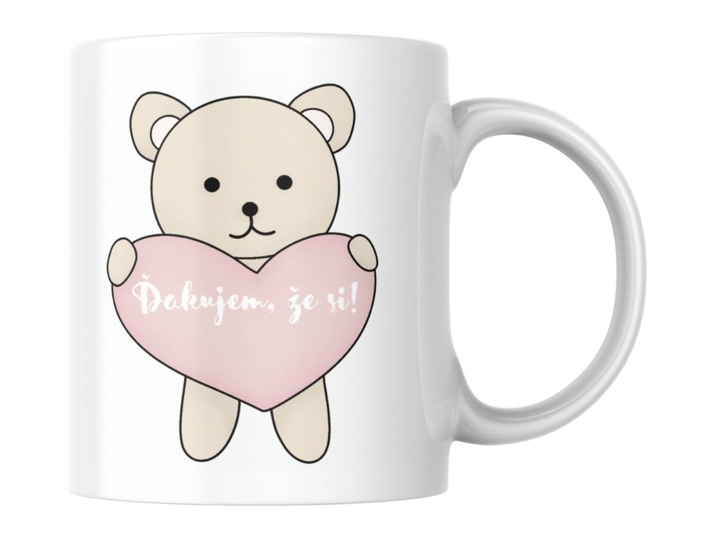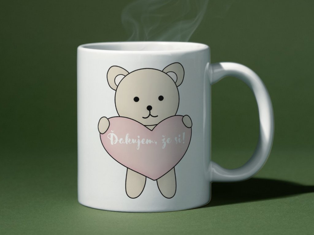 Najkrajšie slová? "Ďakujem, že si!" Medvedík je odjakživa symbolom nehy, ochrany a bezpodmienečnej lásky. Náš roztomilý kreslený medvedík, ktorý nežne drží srdiečko s nápisom "Ďakujem, že si", vyjadruje presne to, čo mnohí z nás cítime, ale málokedy povieme nahlas. Je to objatie v podobe hrnčeka, vďačnosť zabalená do teplého dizajnu!