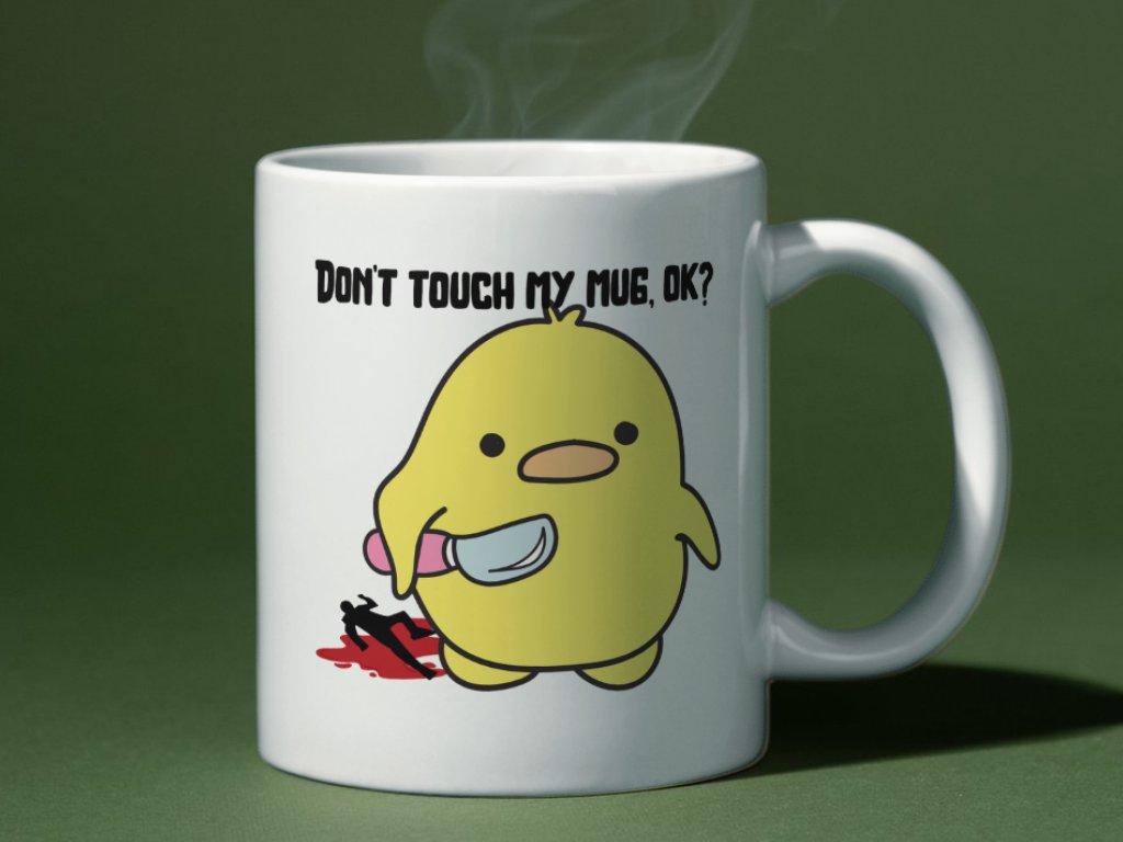 🦆 Vtipné varovanie: "Don't touch my mug, ok?!" – jasný a zrozumiteľný odkaz