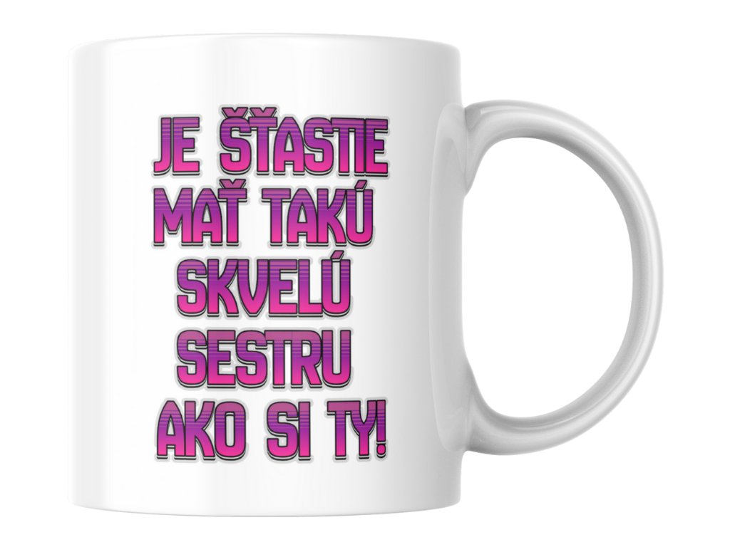 "Je šťastie mať takú skvelú sestru ako si ty!" Toto je hrnček, ktorý vyjadruje najkrajší pocit – vďačnosť za sestru! Keramický hrnček s objemom 330ml s jednoduchým, čistým dizajnom a hlbokým emotívnym odkazom: "Je šťastie mať takú skvelú sestru ako si ty!" Nie je to len hrnček – je to vyznanie šťastia, lásky a vďačnosti!