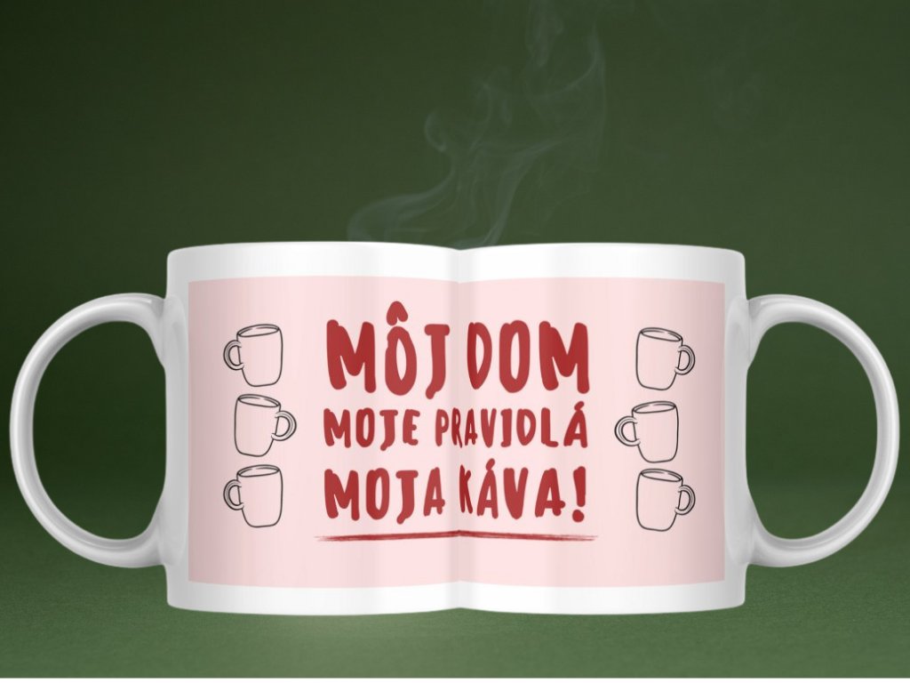 - Živá sublimačná tlač – ružové pozadie, červený text a šálky – moderný a štýlový dizajn