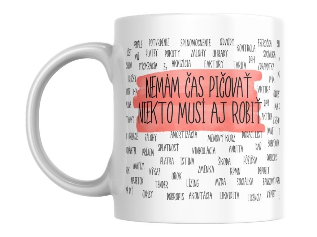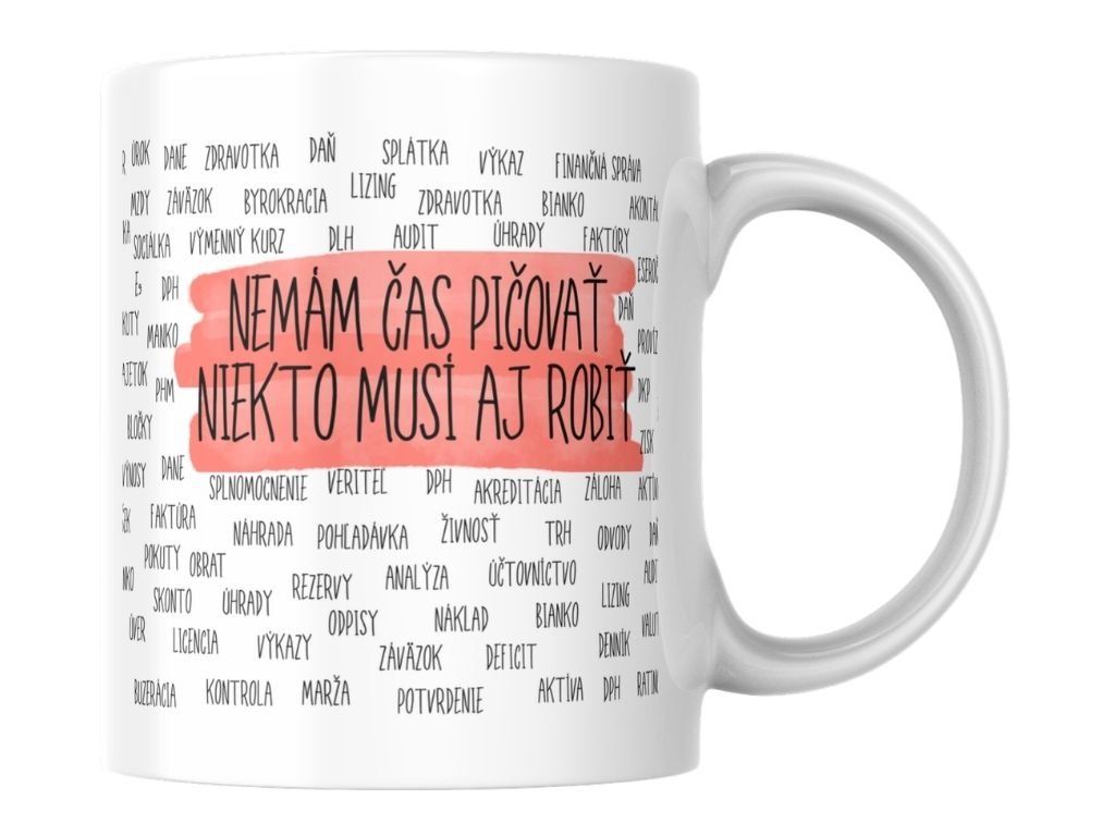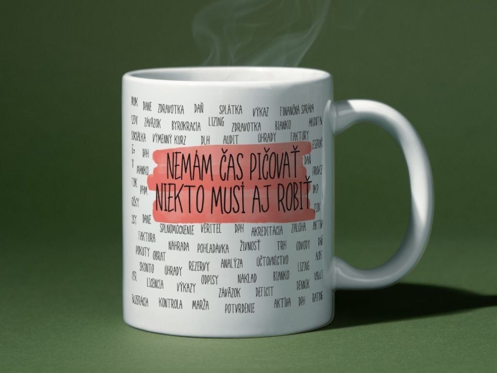 Hrnček pre tých, čo radšej makajú, než kecajú! „Nemám čas pičovať, niekto musí aj robiť" – konečne produkt, ktorý odráža realitu! Náš keramický hrnček je pre všetkých, ktorí vedia, že výsledky neprídu samé a že za každým úspechom stojí kopec roboty, faktúr, odvodov a termínov. Okolo nápisu nájdete množstvo účtovných a podnikateľských výrazov ako: eseročka, zdravotka, sociálka, pokuty, faktúry, výkazy, kontrola, DPH-čka, dane, odvody.