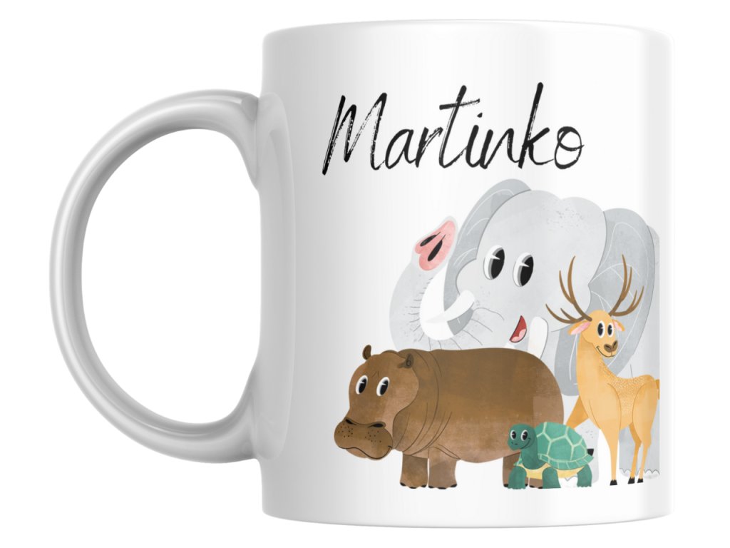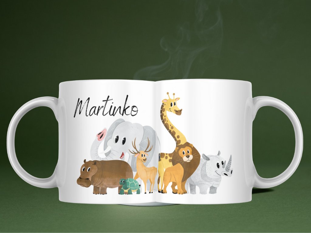 Safari hrnček s menom – pre malých objaviteľov divokej prírody! Každé dieťa miluje zvieratká! Náš personalizovaný keramický hrnček Zvieratká s veselým rozprávkovým safari dizajnom je dokonalým darčekom, ktorý prinesie kúsok divokej prírody priamo na váš stôl. S roztomilými žirafami, levmi, slonmi a ďalšími safari zvieratkami!