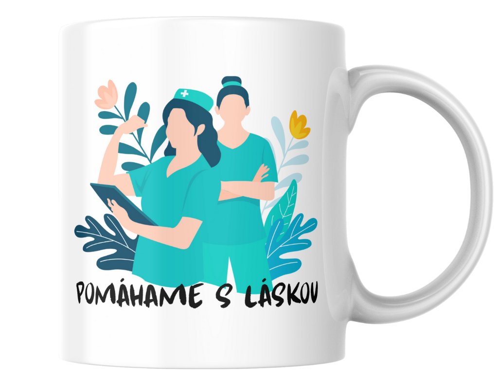 🎨 Sublimačná tlač s motívom dvoch zdravotných sestier a nápisom "Pomáhame s láskou"