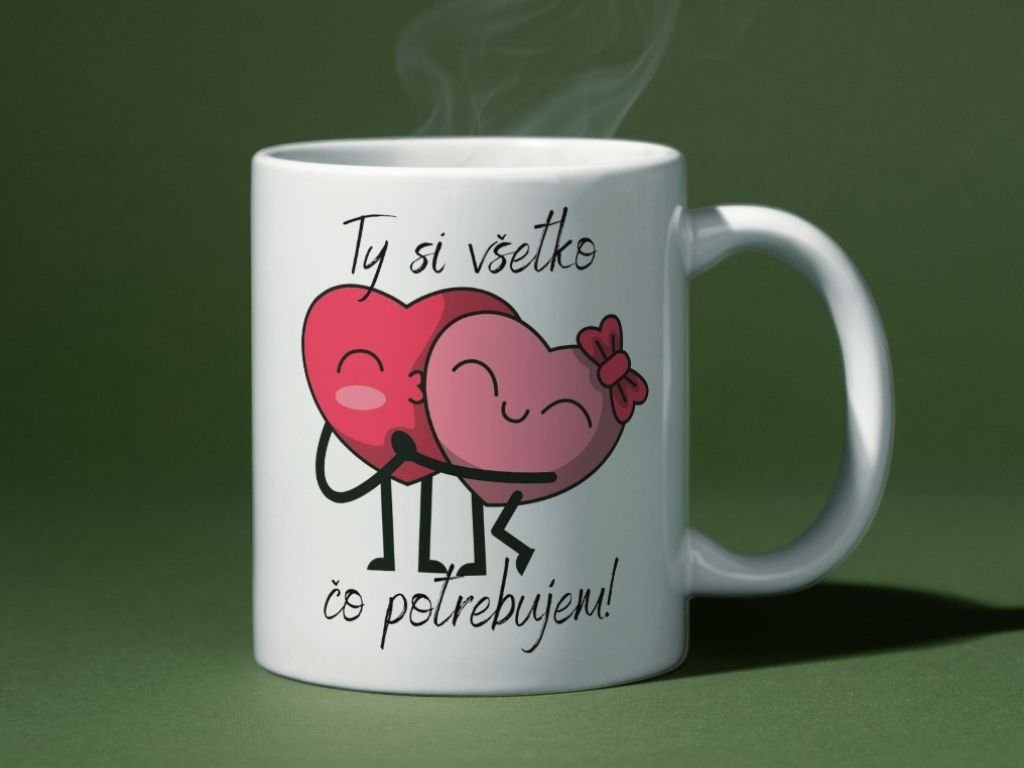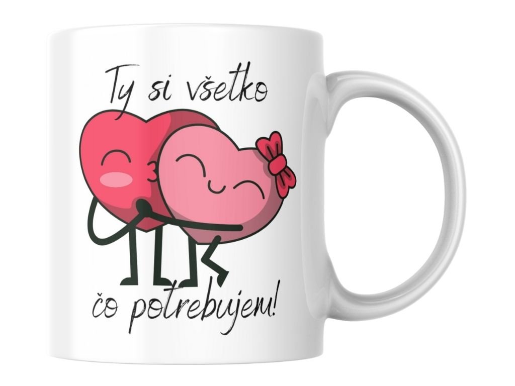 Hrnček nesie jedno z najkrajších vyznaní lásky. Na hrnčeku sú srdiečka, symbolizujúce spojenie, blízkosť a vzájomnú lásku. Text na hrnčeku hovorí jasne: Ty si všetko, čo potrebujem. Nie si jedna z vecí, ktoré potrebujem. Si všetko. Kompletné. Dokonalé.